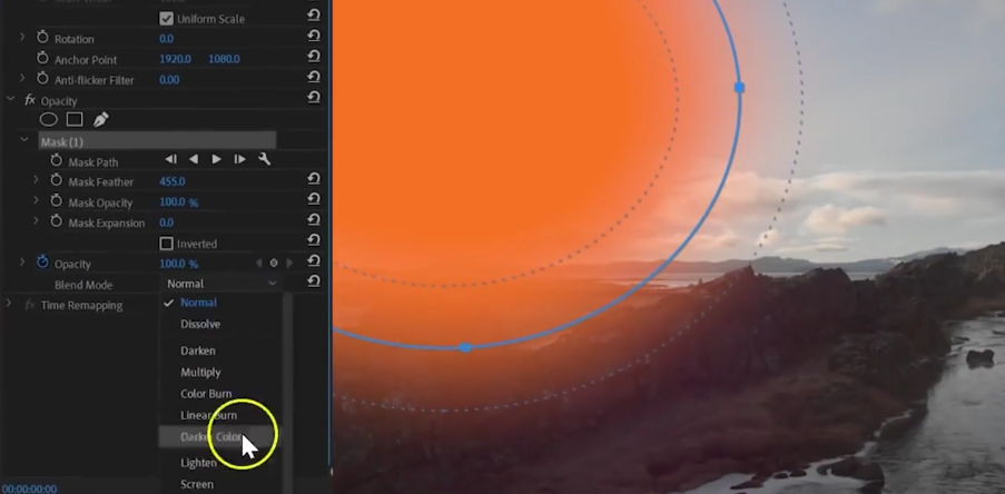 如果希望画面中的光斑或是光线出现在合适的位置,运用PR可以很容易地自己创建一个。具体操作是创建一个新的色块,选择颜色例如橘色,把插入的橘色光斑放在剪辑素材的顶部,在上面创建一层遮罩,调整到比较适合短片素材。最后也要确保羽化遮罩,把混合模式调成屏幕模式,之后可以进一步调整不透明度,甚至是遮罩路径来有组织地移动镜头光圈。