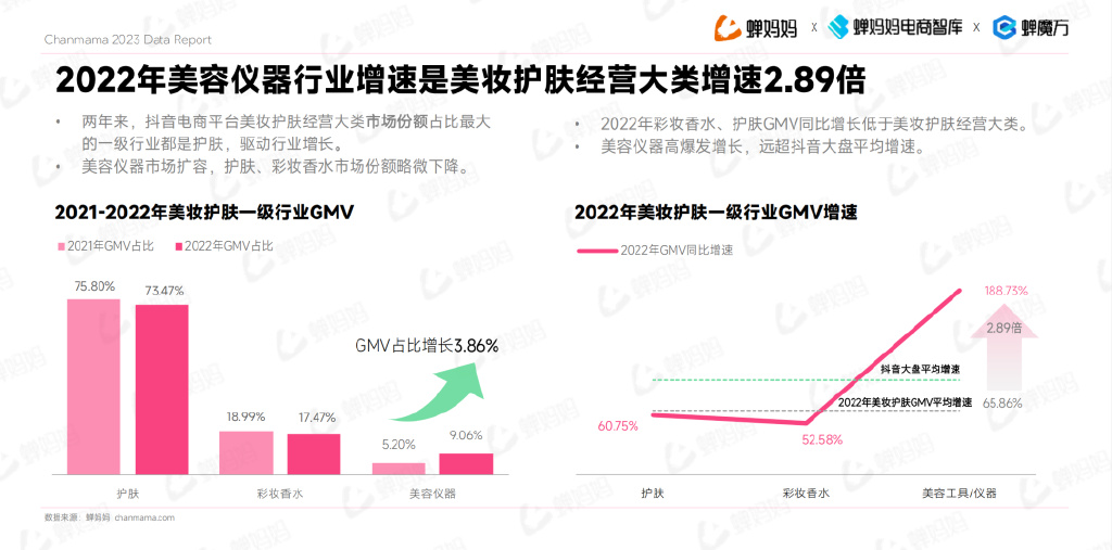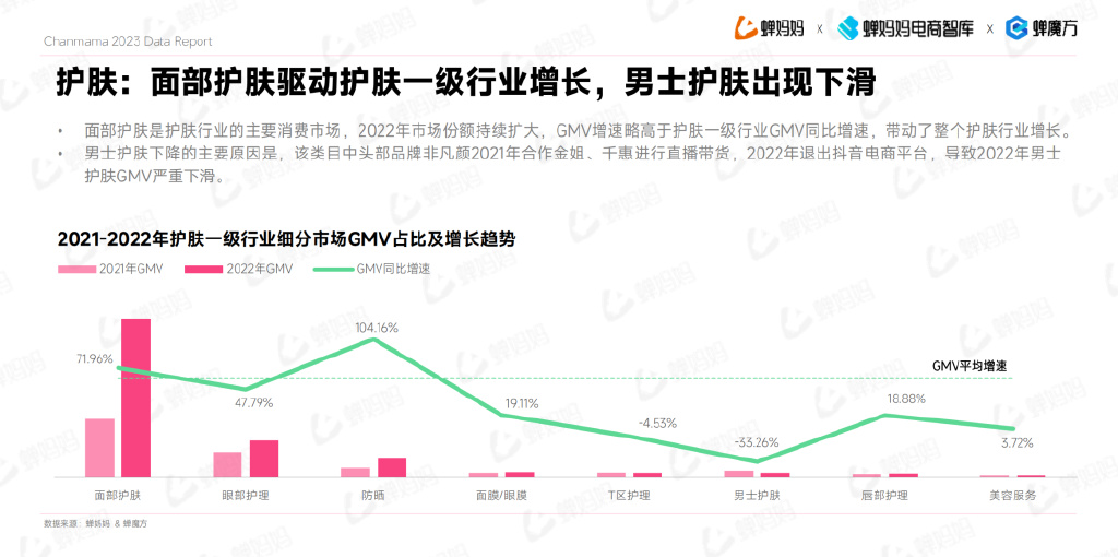 面部护肤是护肤行业的主要消费市场,2022年市场份额持续扩大,GMV增速略高于护肤一级行业GMV同比增速,带动了整个护肤行业增长。