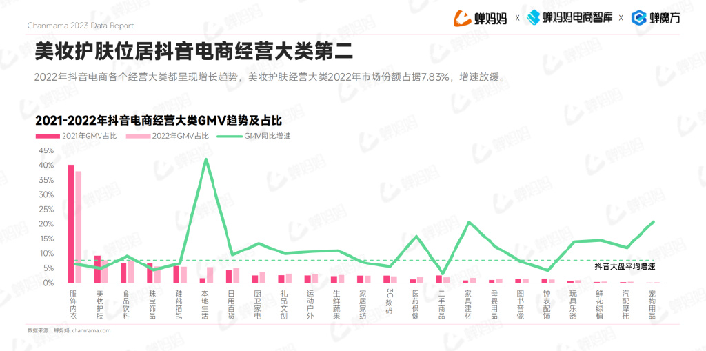 2022年抖音电商各个经营大类都呈现增长趋势,美妆护肤经营大类2022年市场份额占据7.83%,增速放缓。