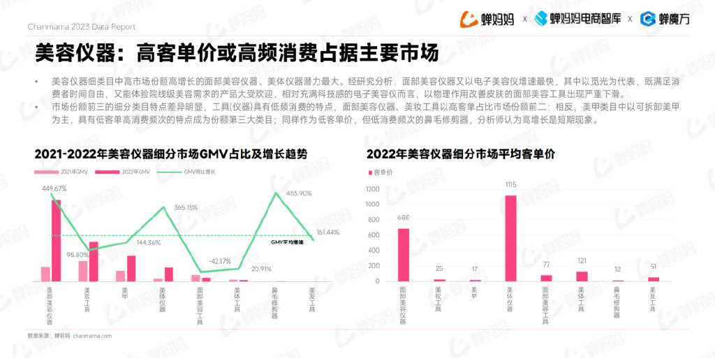 市场份额前三的细分类目特点差异明显,工具(仪器)具有低频消费的特点,面部美容仪器、美妆工具以高客单占比市场份额前二;相反,美甲类目中以可拆卸美甲为主,具有低客单高消费频次的特点成为份额第三大类目;同样作为低客单价,但低消费频次的鼻毛修剪器,分析师认为高增长是短期现象。