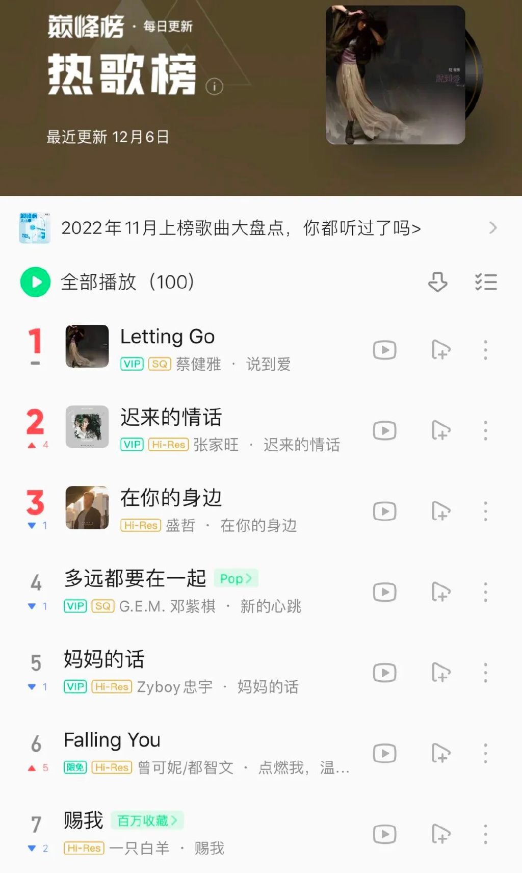 网易云和Q音的榜单同样怀旧。QQ音乐热歌榜前五名,只有一首《赐我》是2022年的新歌。《妈妈的线年的,《在你的身边》是2017年的,《多远都要在一起》是2015年的。TOP1则是蔡健雅发行于2011年的《Letting Go》。