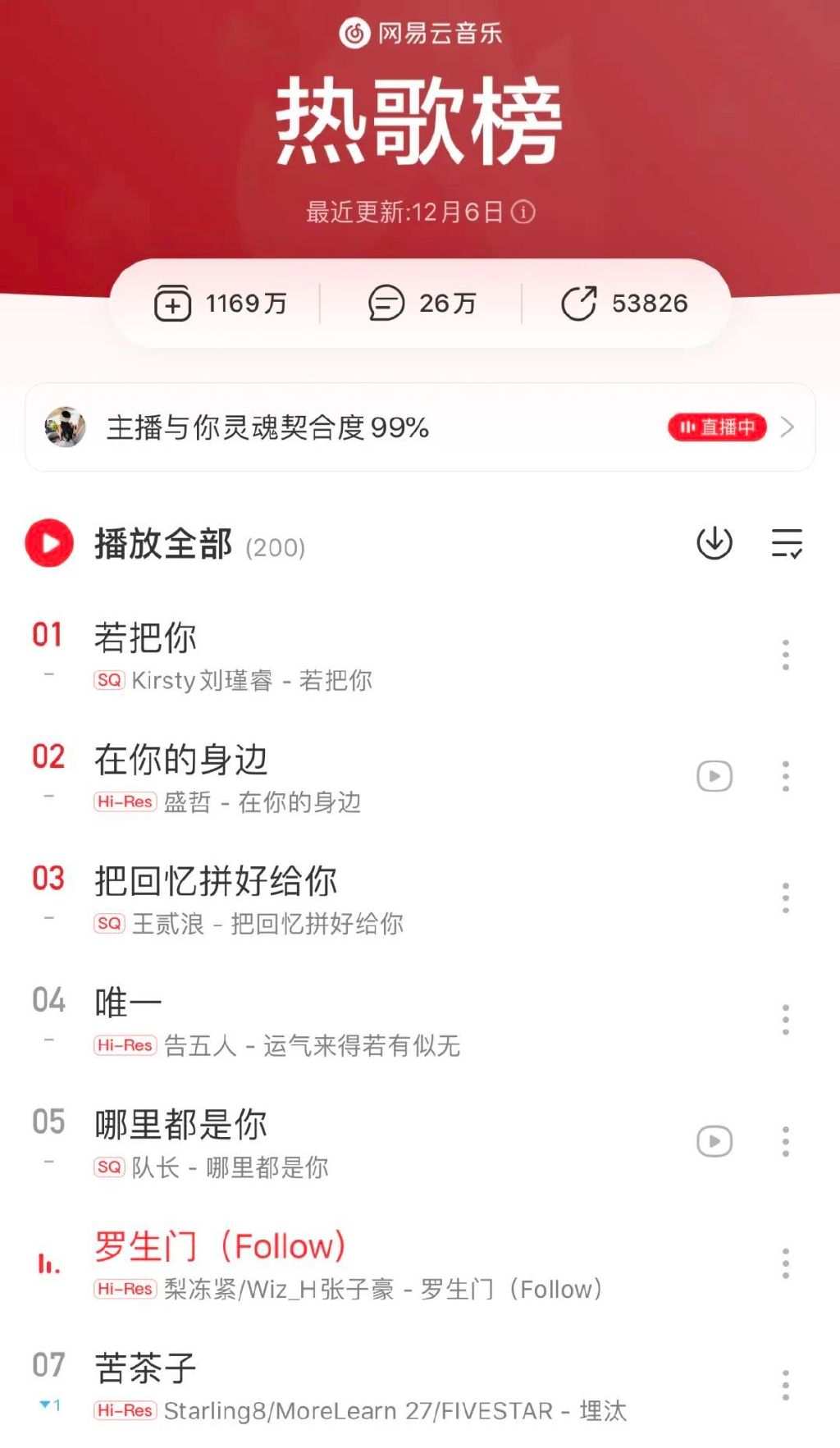 网易云热歌榜TOP5里没有一首新歌。《若把你》《在你的身边》《把回忆拼好给你》《唯一》《哪里都是你》都是2017-2020年的歌。不难看出,在线音乐平台与短视频的热歌榜单正在变得趋同。网易云和Q音里上榜的《赐我》《Letting Go》《在你的身边》都是抖音的热门BGM。