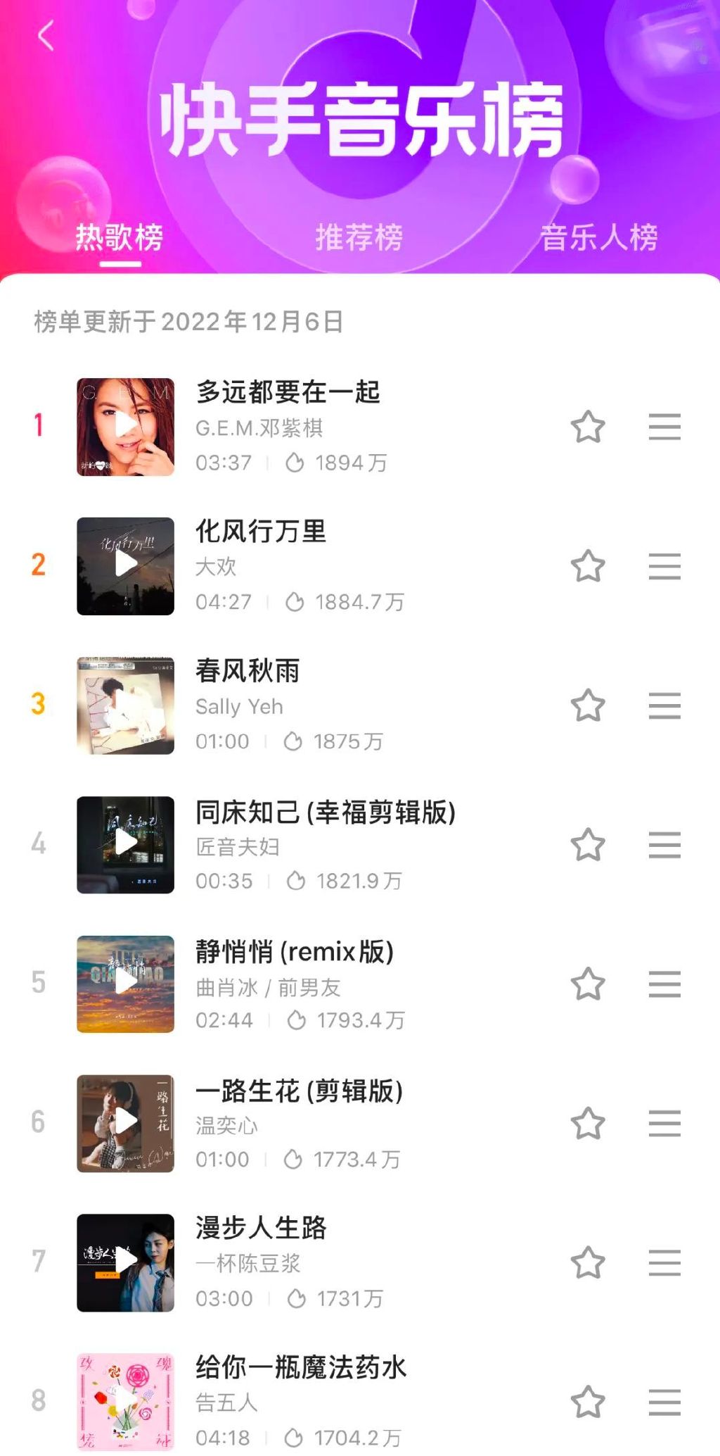 唯一还有点独立王国既视感的,是快手。除了《多远都要在一起》,榜单前几名中的《化风行万里》《春风秋雨》《同床知己》《静悄悄》倒和别家不同。尤其是叶倩文1996年发行的《春风秋雨》,真有金曲怀旧的况味。