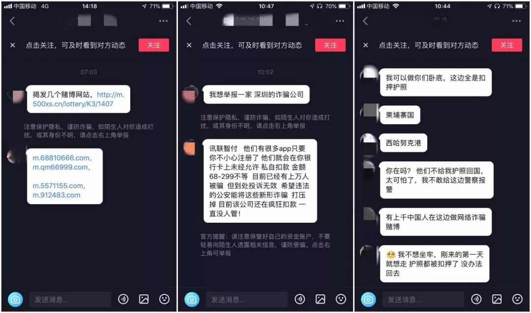 抖音骗局屡见不鲜2018年以来,仅深圳龙岗区,涉抖音诈骗案件就达到90宗。其中,征婚交友诈骗28宗,投资诈骗23宗,网购诈骗17宗稳居前三。龙岗公安抖音号也收到了大量网友的留言求助,大部分是“杀猪盘”骗局的受害者,甚至还有自称是被骗到东南亚诈骗集团的“狗推”举报,可见抖音中骗子之多。