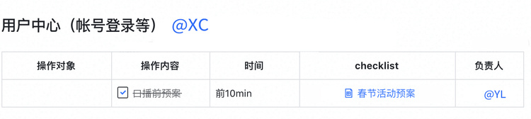 YL放下手中的工作,飞书文档中,为“口播前预案”,写了一个checklist(检查清单)。然后在这个“除夕活动剧本操作手册”里,@了一下这篇预案。