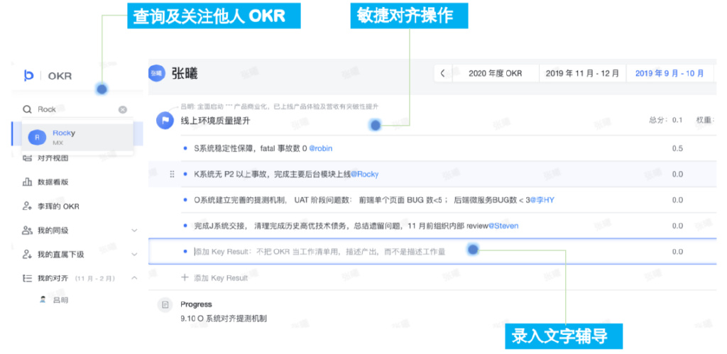 为什么?第一是对齐,所有人定目标时,左看右看,上看下看,保持目标一致,力出一孔。第二是协同,一起开会前,先看看对方的OKR,知道怎样合作,能帮到共同目标的实现。