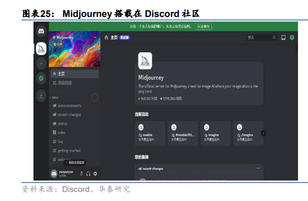 由 Midjourney 生成的《太空歌剧院》出圈,引发社会广泛讨论。Midjourney 是一款搭载 在 Discord 上的聊天机器人,玩家只需要@机器人并输入相关的提示词(Prompts)即可 在 1 分钟以内生成 4 张图片。凭借着极低的上手门槛和 Discord 社区加持,截至 2023 年 2 月 4 日,Discord 数据显示 Midjourney 在 Discord 约有 980 万成员。2022 年 8 月,由 Midjourney 生成的《太空歌剧院》在美国科罗拉多州艺术博览会上获得“数字艺术”类别 的冠军,使得 AI 绘画引发了广泛的关注,围绕 AI 能够替代艺术创作的讨论热度较高。