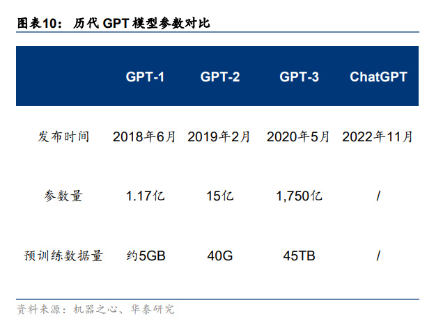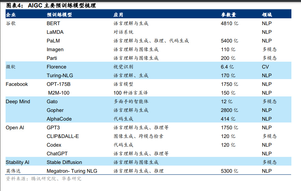 基础层即预训练模型,构成了 AIGC 的基础。随着预训练模型参数的增加,预训练所需要 的数据量同样快速提升,带来较高的成本投入。据中国信通院与京东探索研究院发布的 《人工智能生成内容白皮书 2022》,模型参数量已从最初的千万级发展到了千亿级别,训 练代价也从数十天增长到几十万天(按在单张 V100 GPU 计算)。据北京智源人工智能研 究院,2020 年 OpenAI 发布的 NLP 模型 GPT-3 的参数量约 1,750 亿,训练数据量达 45TB,模型训练成本近 1,200 万美元。因此该领域的参与者主要是科技巨头与头部的研究 机构,如 OpenAI、谷歌、微软、Meta、百度等。