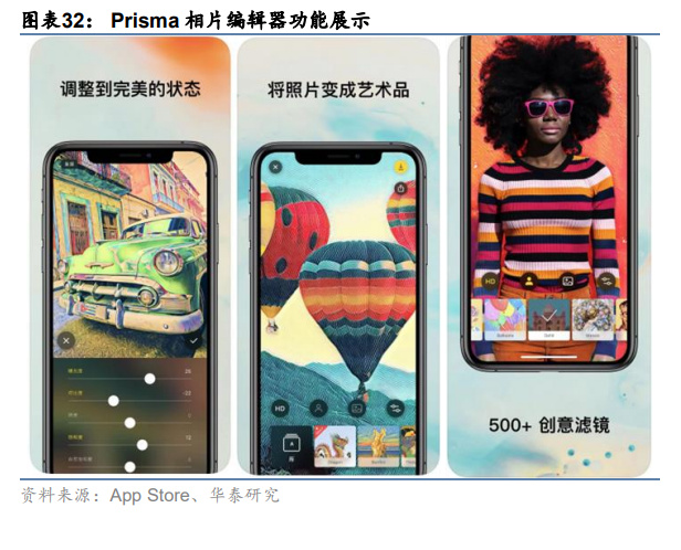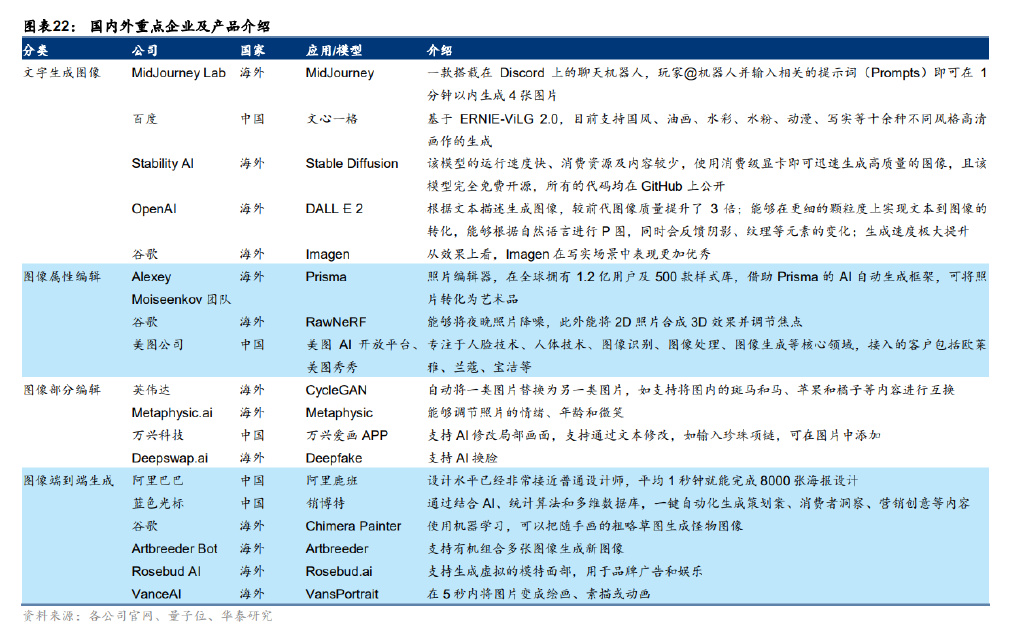 据量子位,AI 图像属性编辑包括去水印、自动调整光影、设置滤镜、修改颜色纹理、复刻 /修改图像风格、提升分辨率等,类似于低门槛的 PS(Photoshop)。在该领域布局的初创 公司较多,并且谷歌、Adobe 等大厂亦有涉及。国外方面,以 Prisma 为例,作为一款照 片编辑器,在全球拥有 1.2 亿用户以及 500 款样式库,借助 Prisma 的 AI 自动生成框架, 用户无需投入精力即可将照片转化为艺术品;谷歌的 RawNeRF 技术能够将夜晚照片降噪, 此外能将 2D 照片合成 3D 效果并调节焦点;国内的代表产品为美图公司,旗下的美图 AI 开放平台专注于人脸技术、人体技术、图像识别、图像处理、图像生成等核心领域,为客 户提供经市场验证的专业 AI 算法服务和解决方案,目前接入的客户包括欧莱雅、兰蔻、宝 洁等,助力图像属性处理;面向 C 端的美图秀秀则通过医美级去皱、面部丰盈、一键更换 刘海等增值功能收费。