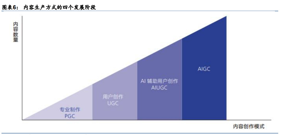 AIGC 技术的突破性进展引发内容生产方式变革,内容生产由 PGC(专业制作)和 UGC (用户创作)时代逐渐步入 AIGC 时代。AIGC 顺应了内容行业发展的内在需求,一方面 内容消费量增加,急需降低生产门槛,提升生产效率;另一方面用户端表达意愿明显上升, 消费者对内容形态要求更高,内容生成个性化和开放化趋势明显。