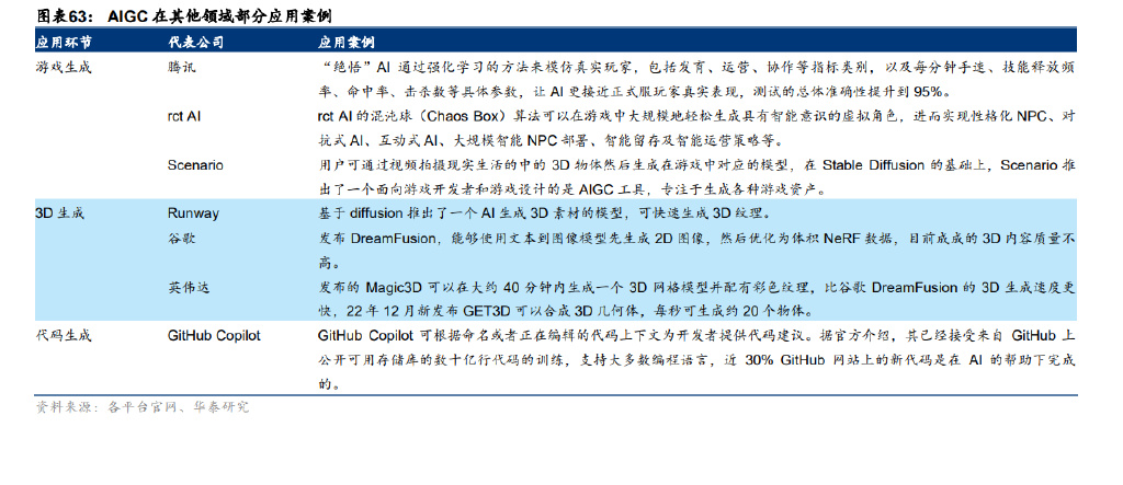 AIGC 应用场景多元,随着 AIGC 技术发展愈加成熟,在游戏/代码/3D 生成等领域将迎来 蓬勃发展。目前游戏生成中游戏操作策略生成、NPC 逻辑及剧情生成和游戏资产已经得到 应用,AIGC 生成代码能替代编码中大部分重复性劳动,3D 生成尚处于早期阶段。代表产 品/公司包括 Deepmind、rct AI、腾讯、Scenario、Runway、Epic Games 游戏《黑客帝 国:觉醒》、谷歌 DreamFusion、英伟达 Magic3D 和 GET3D、GitHub Copilot 等。