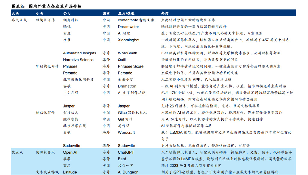 结构化写作已经在新闻写作、公司财报、客服类聊天问答等场景广泛应用。国外方面,代 表性的垂直公司 Automated Insights 成立于 2007 年,旗下的 Wordsmith 是一个自然语言 生成平台,能够借助 NLP 技术将数据转化成描述性的语言,据公司官网,目前 Automated Insights 已经在新闻写作中具有较广泛的应用,下游的客户包括雅虎、美联社 等主流媒体。国内方面,小冰公司、腾讯、百度、字节、澜舟科技等公司均有布局。澜舟 科技成立于 2021 年,主要产品是基于“孟子轻量化预训练模型”打造的一系列 SaaS 功 能引擎,被广泛应用于包括搜索、生成、翻译、对话等领域。字节推出的 Xiaomingbot 是 新闻写作机器人,该机器人在里约奥运会上,共撰写了 457 篇关于羽毛球、乒乓球、网球 的消息简讯和赛事报道。整体来看,目前结构化写作已具备较成熟的应用,长期来看, Narrative Science 创始人预测到 2030 年 90%以上的新闻将有 AI 写作完成。